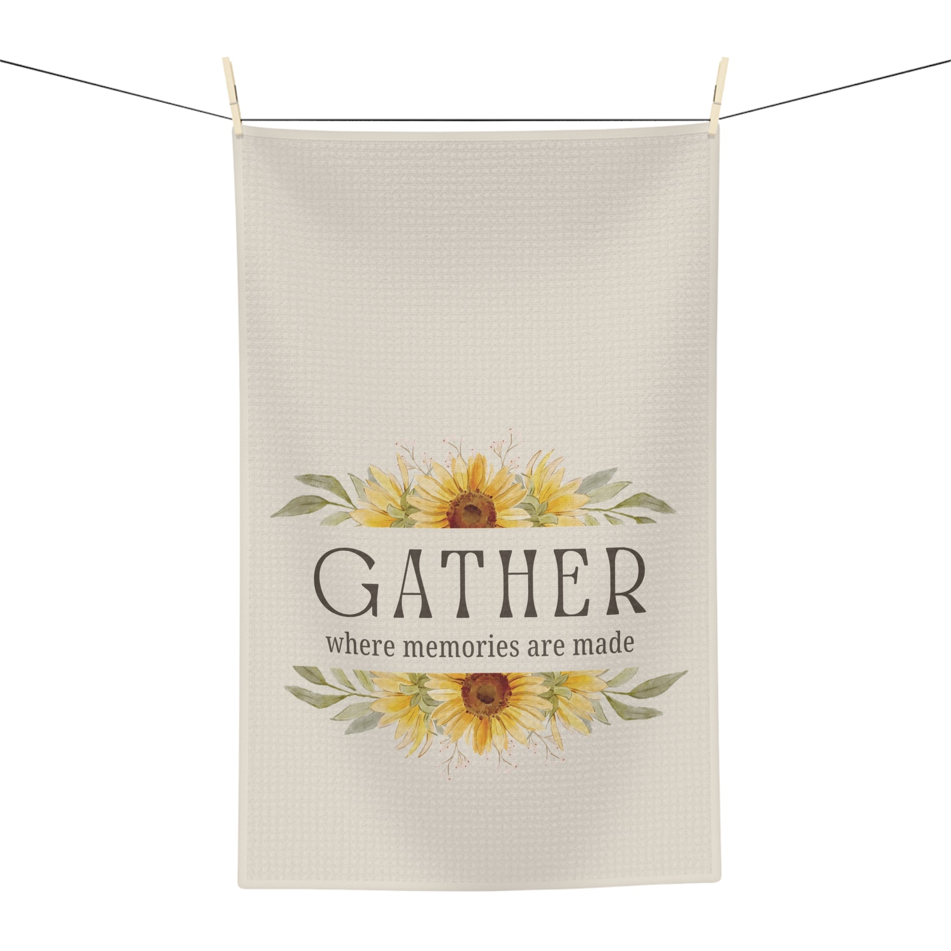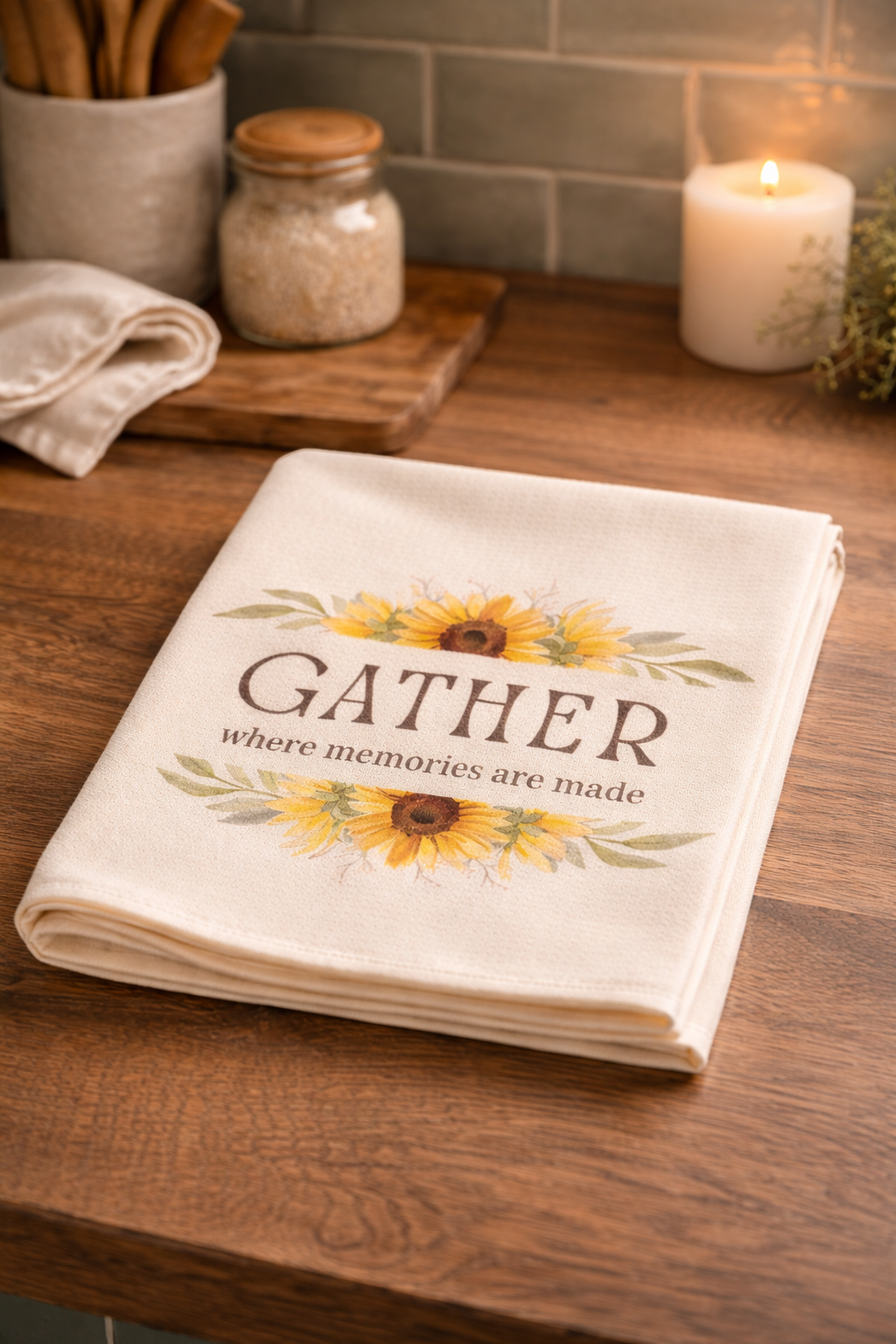 Soft sunlit sunflowers and delicate greenery frame the word Gather with the gentle line where memories are made beneath. Calm neutrals and rustic detailing give this towel a welcoming presence that feels layered, lived in, and quietly meaningful.
